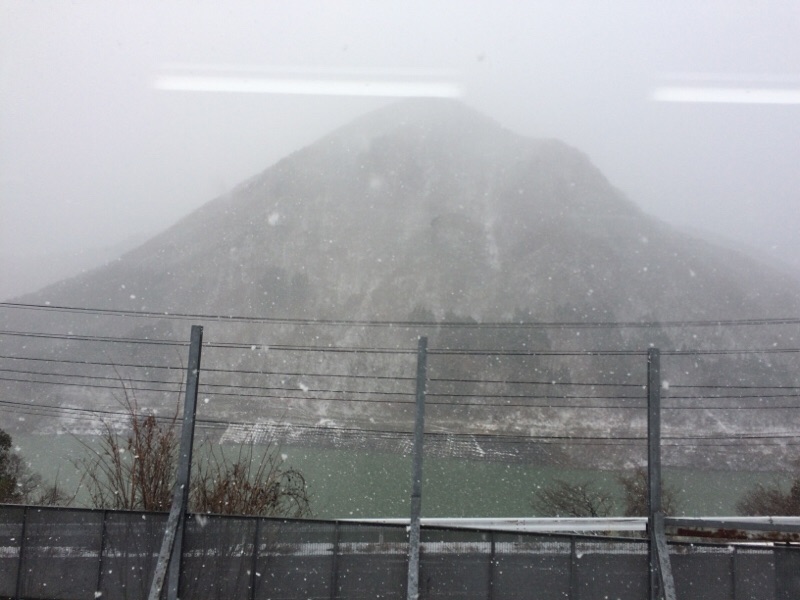 会津芦ノ牧温泉辺りです。 先ほどまでは晴れていたのにこの辺は雪が結構降っています。 バックの山はなんだか日本昔話に出て来そうな山です。 ヨセフ