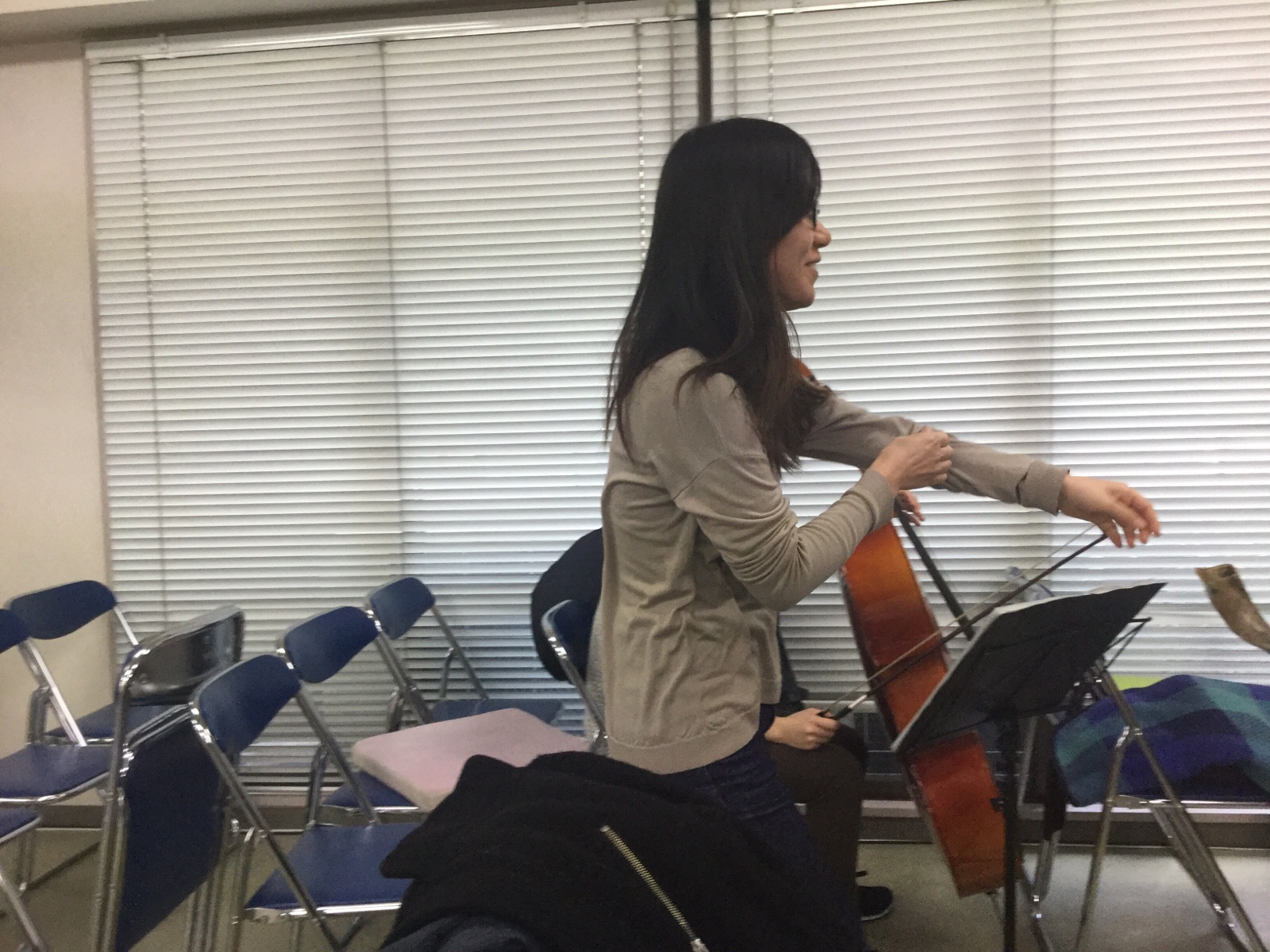 愛ちゃん角笛を吹きならします。