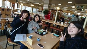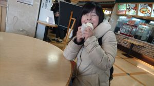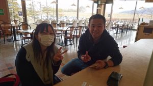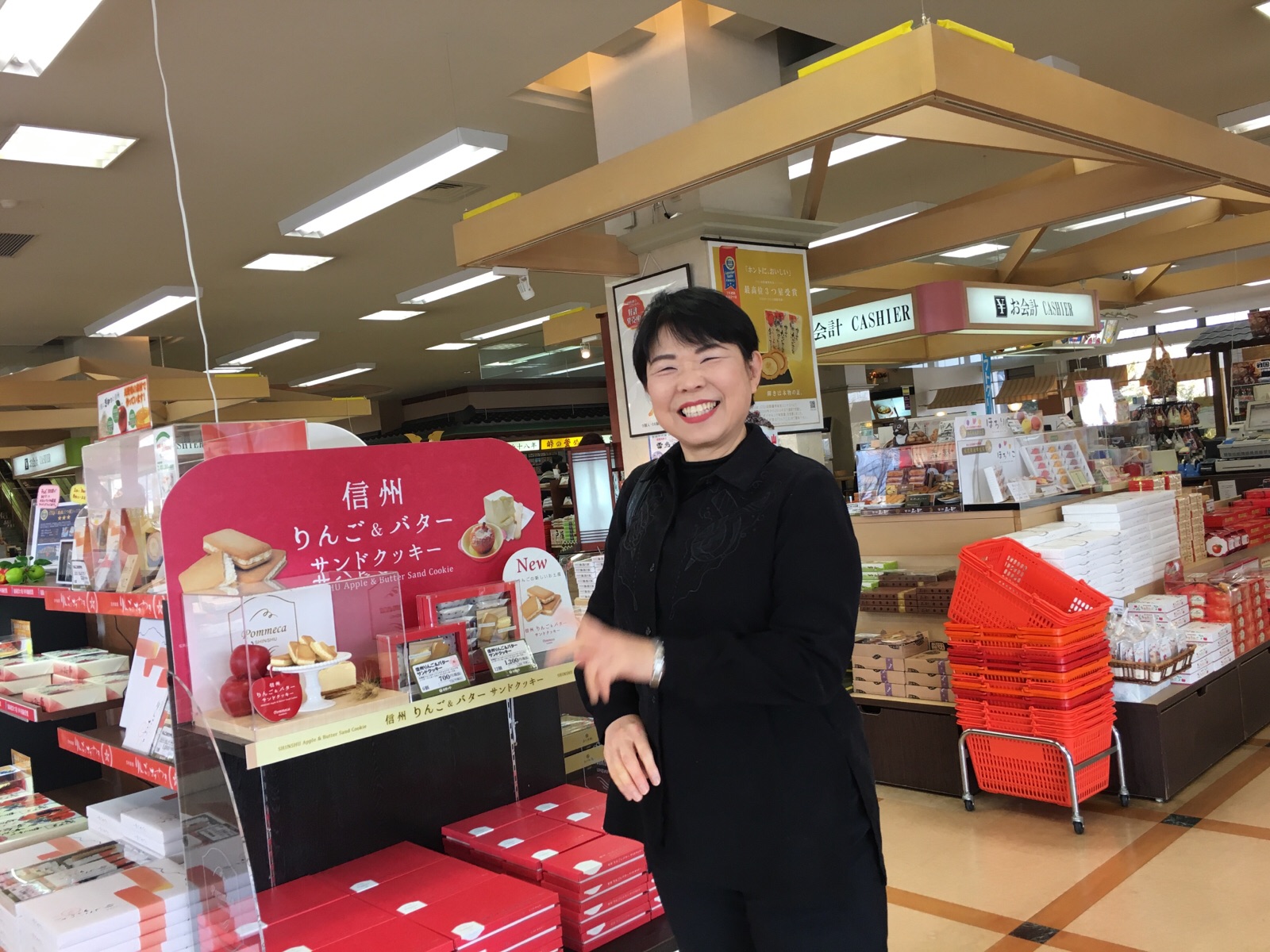 先程のお昼食べる所で撮った写真。 りんごのお菓子と今村さん! 爽やかな笑顔。 東京アンテオケバス1号