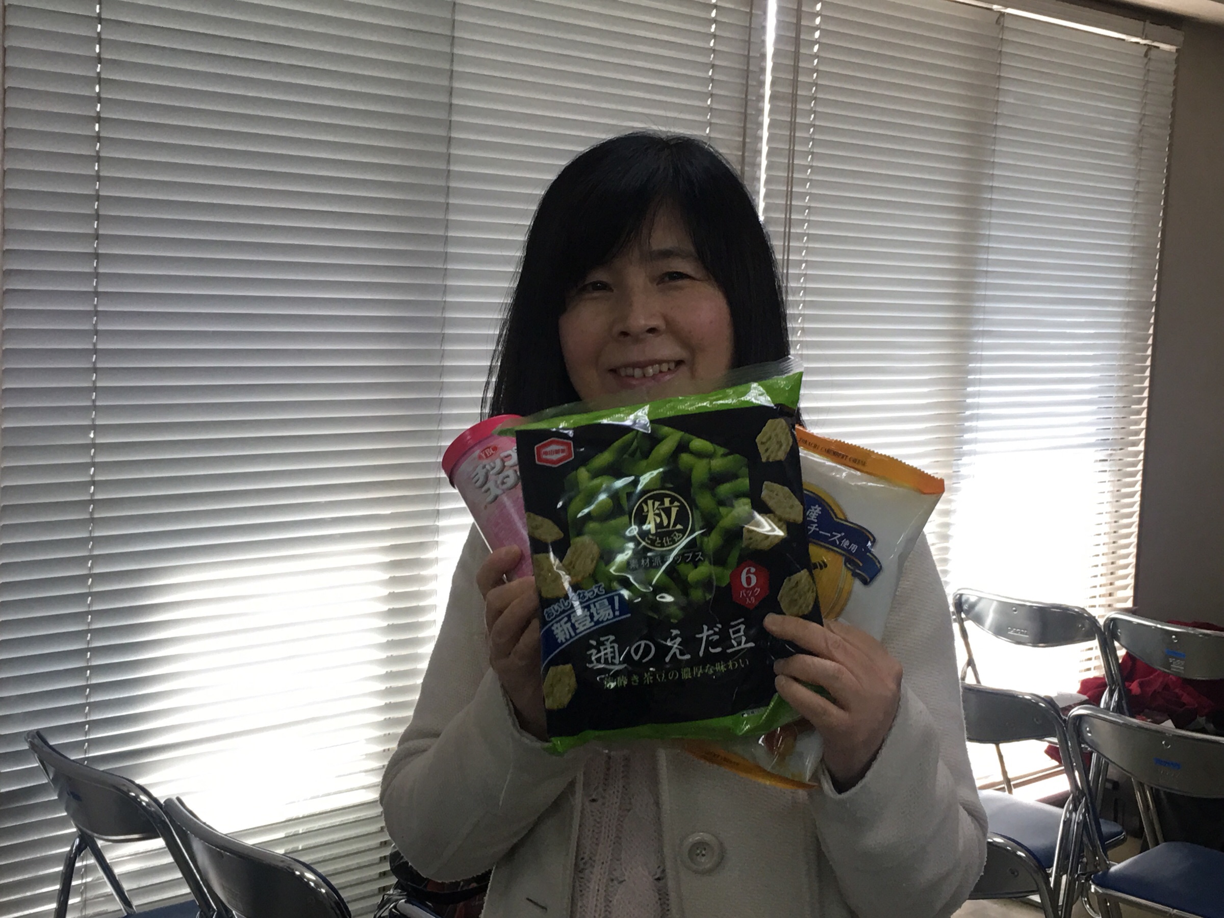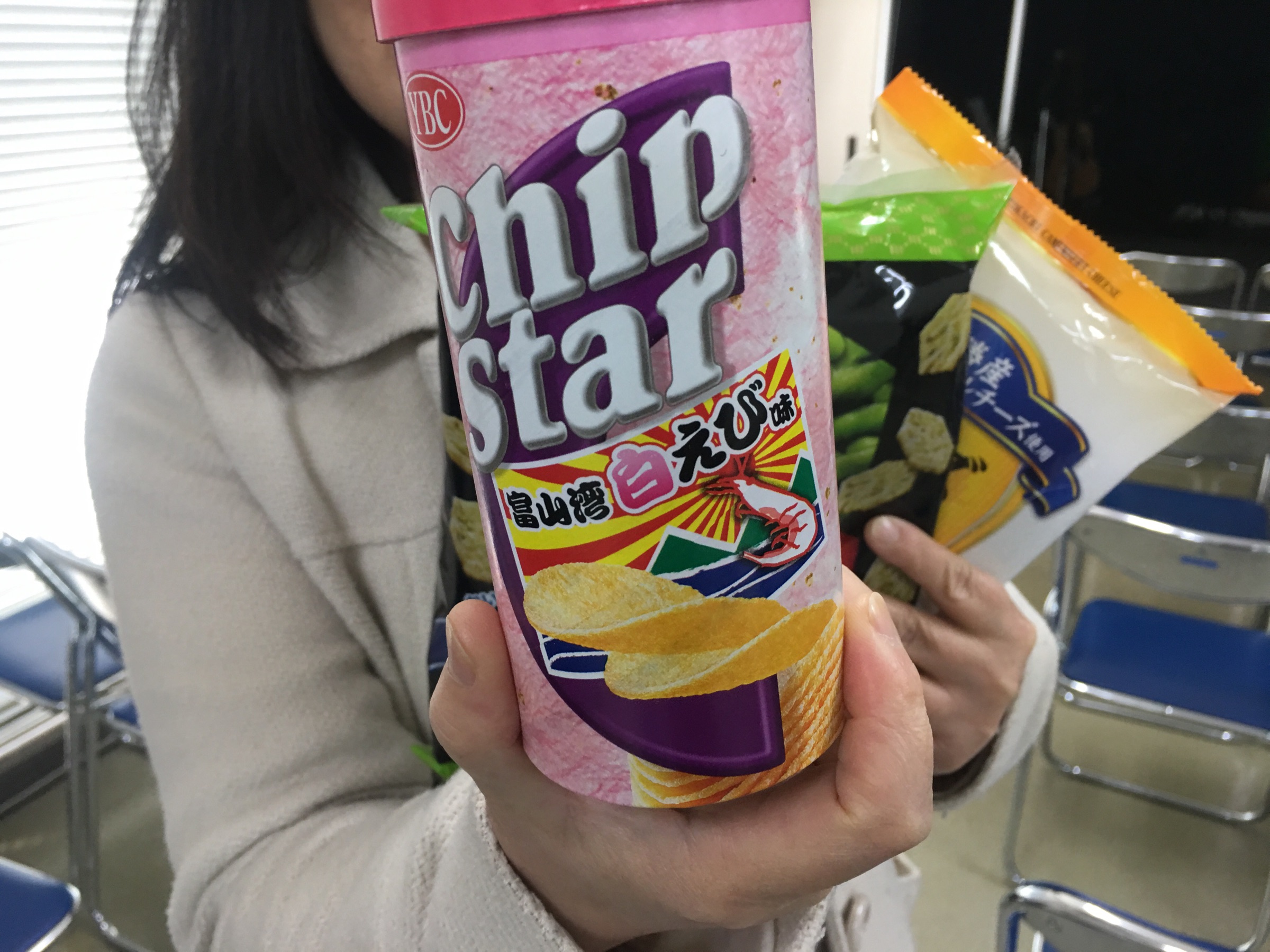 北陸から帰ってきた笠原さんからお土産をもらいました! 富山名物、白えびチップス美味しそう〜。 Gifts
