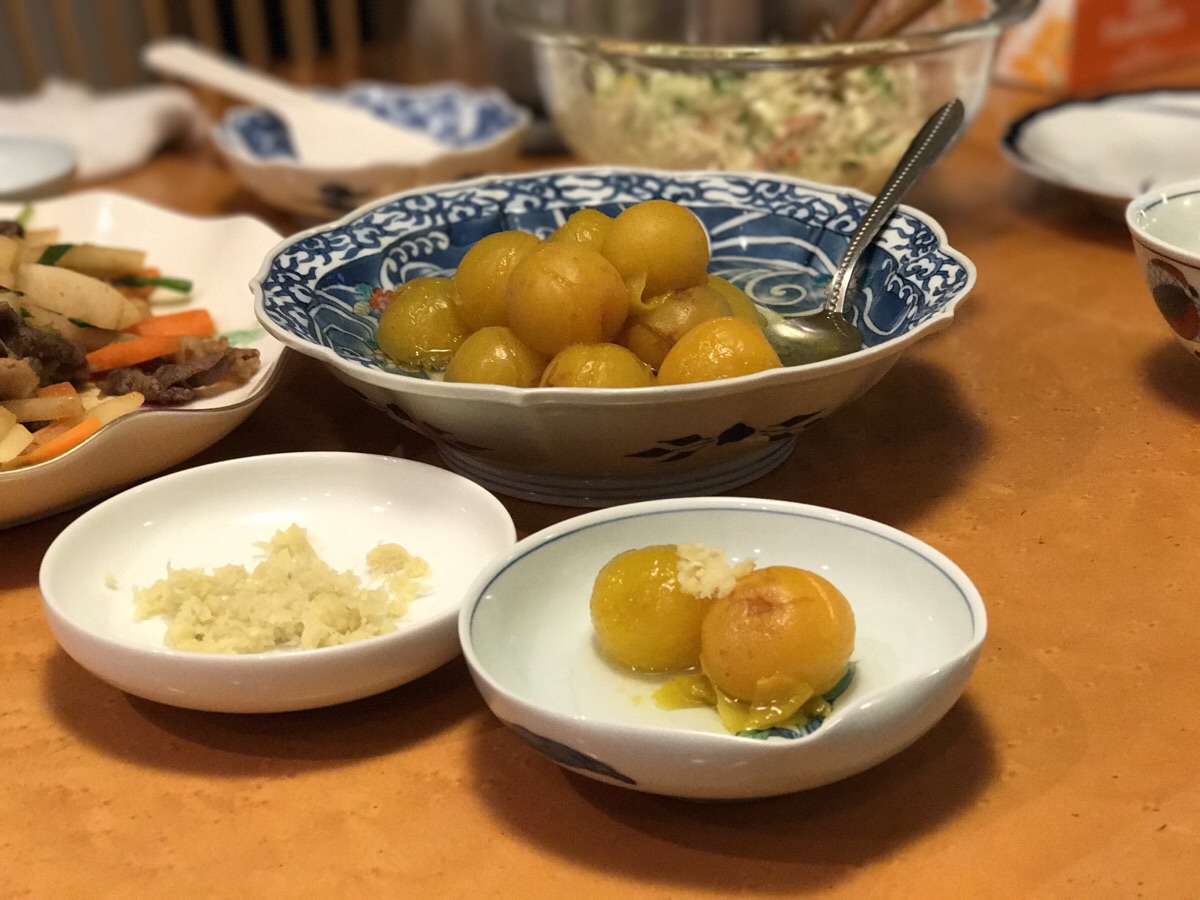 庭に落ちていた完熟梅で煮梅を作りました。というか、水から茹でただけです。おろし生姜に醤油をかけて食べるのが我が家流。福岡Sada