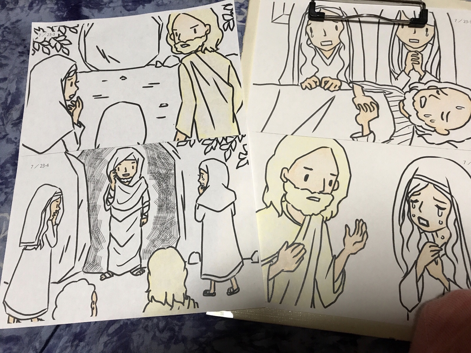 今日の秩父も暑かっったデス☀︎ 「お」さんがべーちゃんに会えますように^ – ^ 日曜日の紙芝居用の塗り絵をしています⤴︎ 今度のお話しは『ラザロの復活』です! やまなか