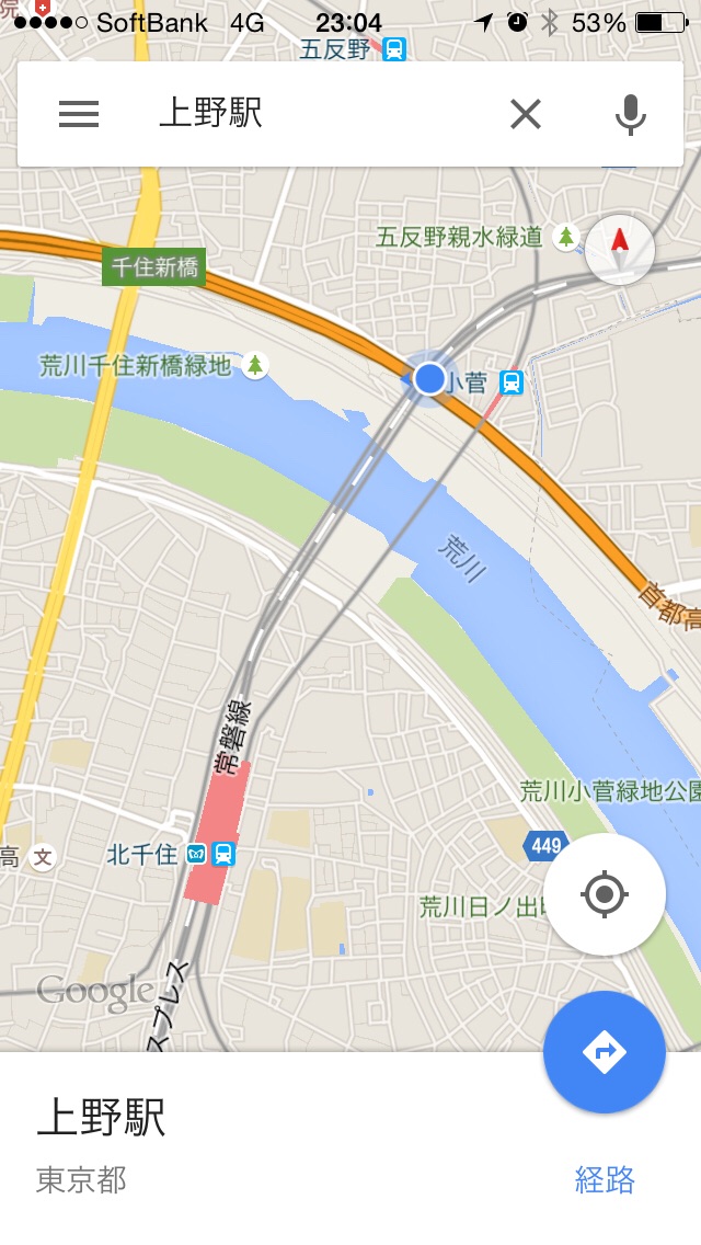 青の丸の所で、止まってます。 後、少し。 北千住からは、常磐線で上野にいけるそうです。 ひかる 栃木・磐城へ行く