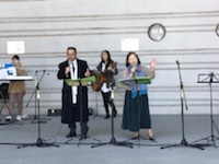 赤ちゃんを抱っこしたお母さんが、賛美隊の方に赤ちゃんの顔が向くように、赤ちゃんが動くたびに方向転換されて………赤ちゃんに一生懸命聞かせようとしている姿に、賛美隊も励まされました。「きれいな歌ですね。」といられました。寒かっけれど、雲ひとつない青空の下でコンサートを祝福して下さった、神さまに感謝します。*\(^o^)/*
