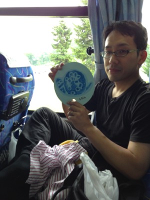 父の日に娘のシオンちゃんが作ってくれたうちわを、披露しています。(アンテオケバス1号車)
