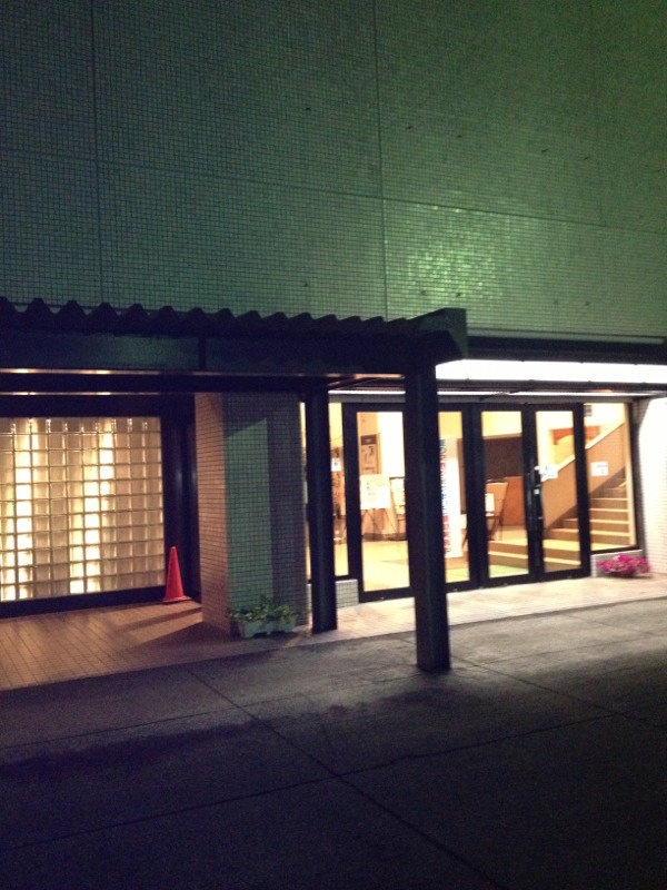暑いので、外でブログやってます。中の人すみません。夜の大町市文化会館です。