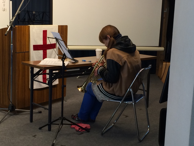 会堂で熱心に練習している滝田由美ちゃん! トランペットの音がだいぶ出るようになってます。 Kayano