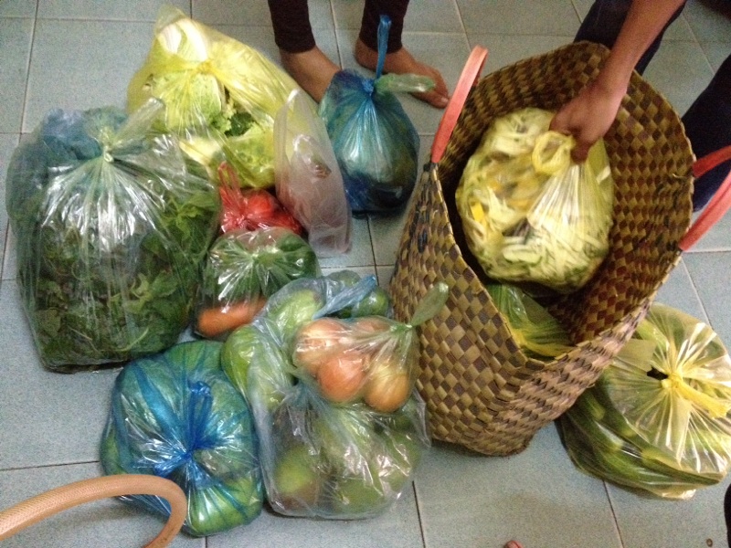 市場に買い出しに行ったスタッフさんが戻りました。今日のメニューは何でしょ〜。 カンボジア Imai