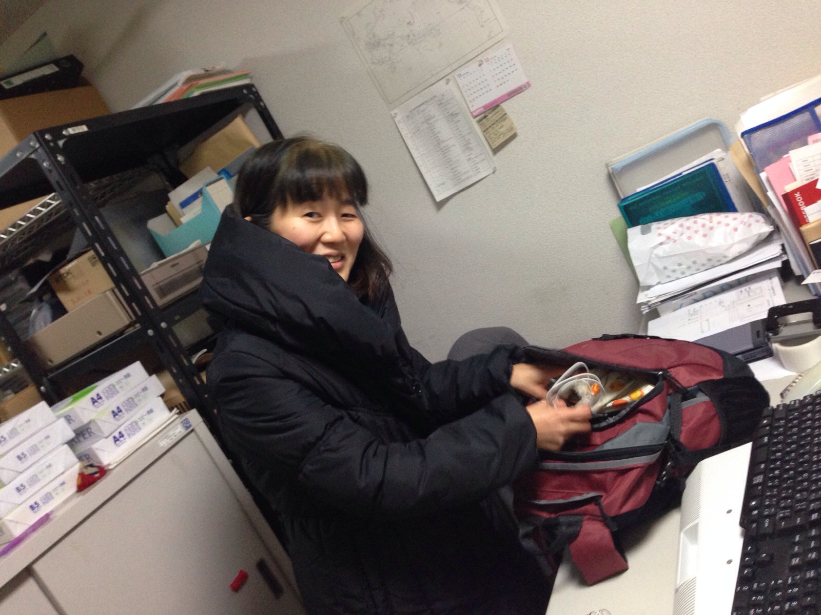今から雲の間にある虹出版へ出勤出されます加藤さん。荷物を詰めこんでいます!