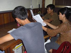 来週の献立を、子ども達の希望も聞きながら作成中・・・。 (写真:左からM、スタッフのNさん、K。)