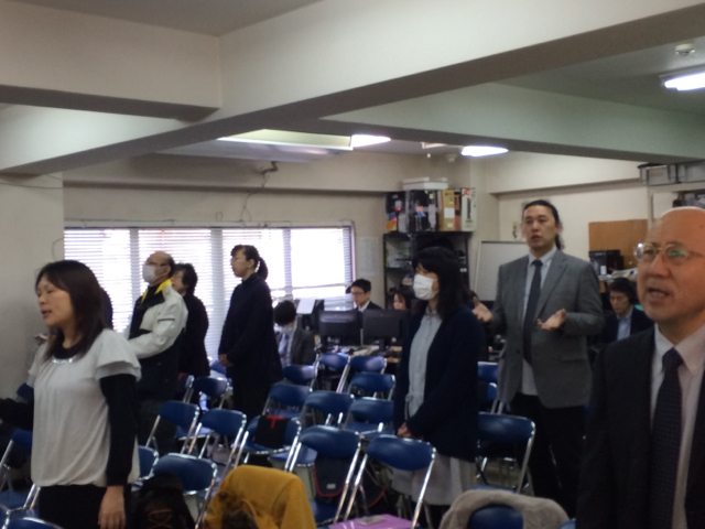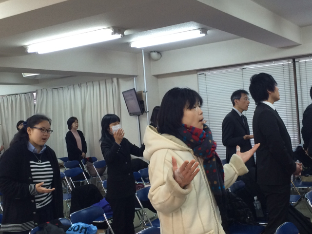 第一礼拝の特別賛美を前に、お祈り中。