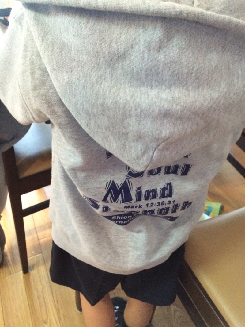 息子、マルコの聖書箇所のパーカーでヨセフさんと出発しました ハルミ
