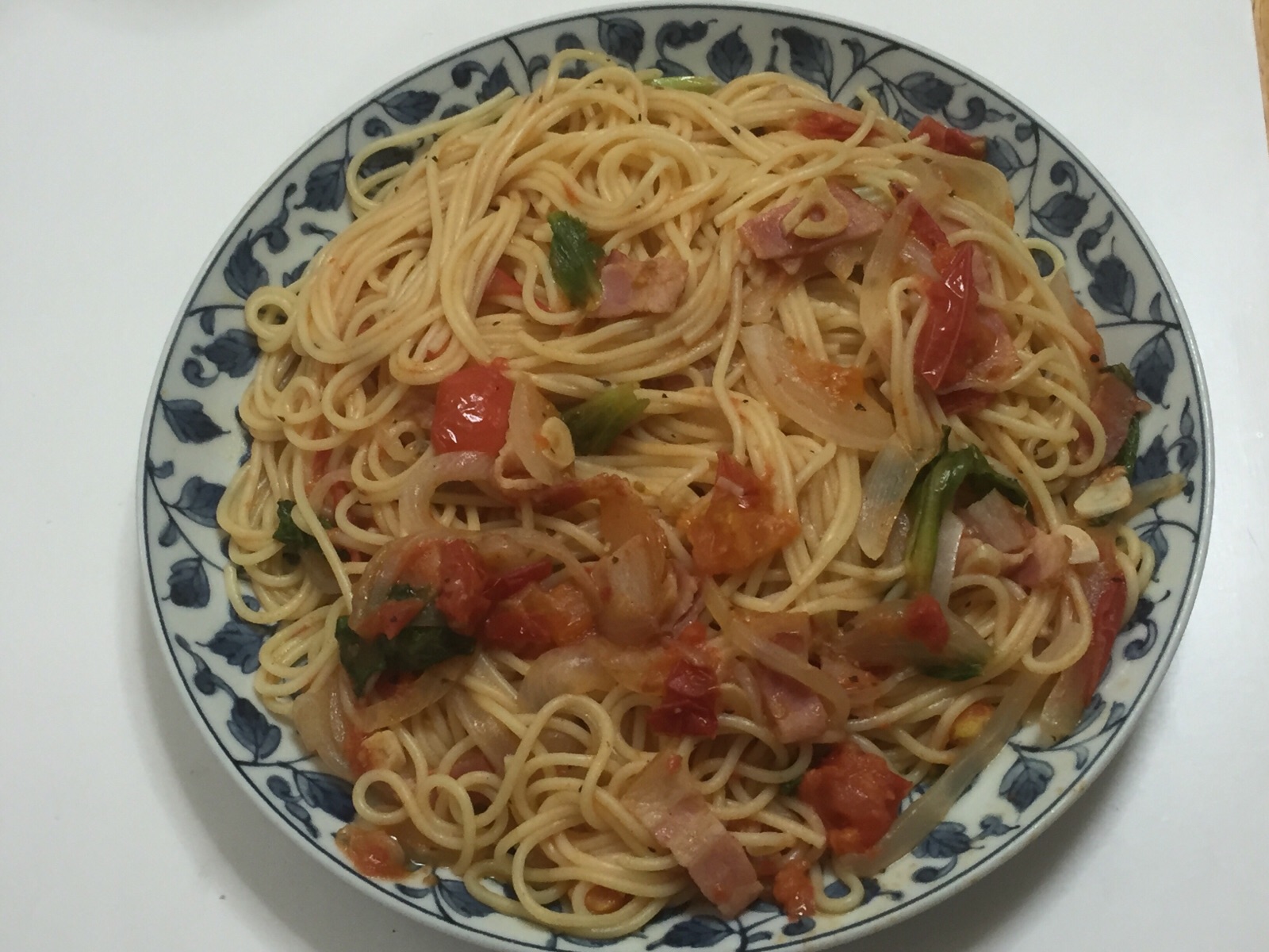 ✳︎ 「スパゲティ」(トマトをいっぱ〜い入れて、新玉ねぎ、ベーコン、グリンリーフ)