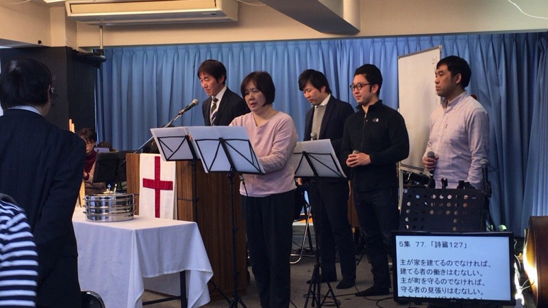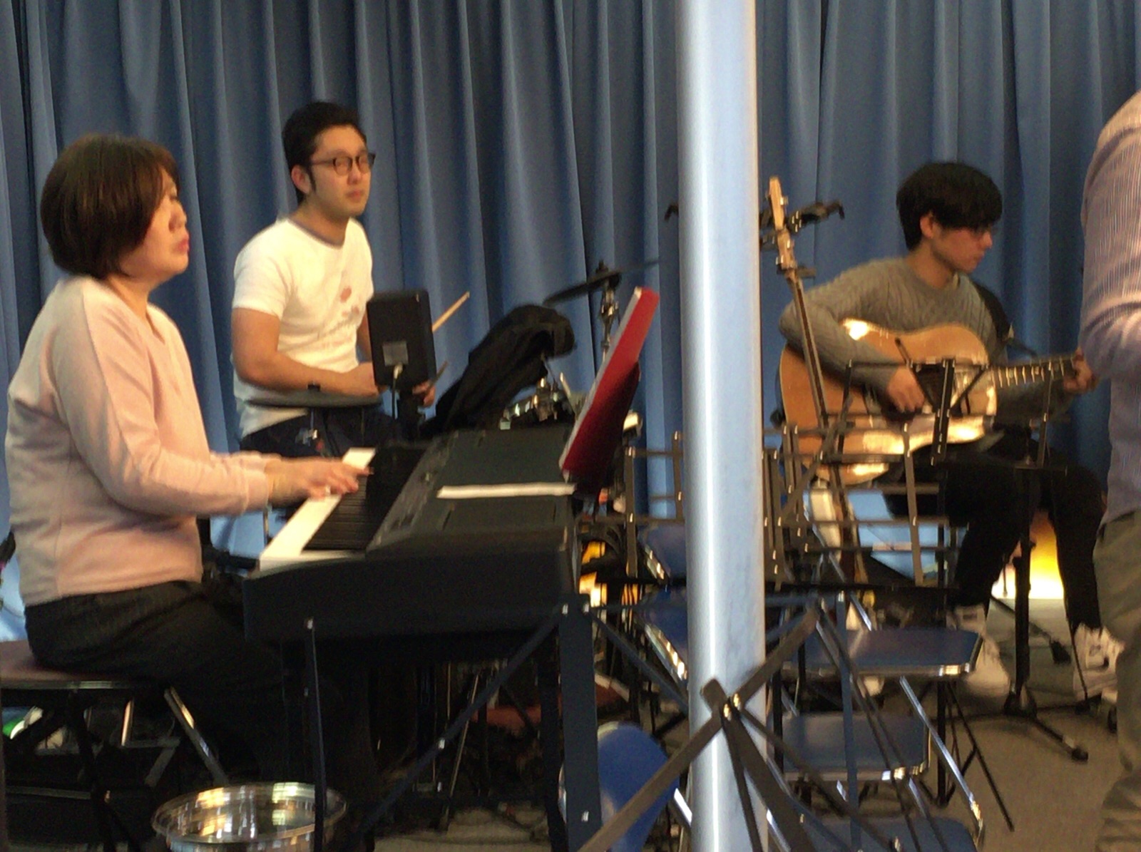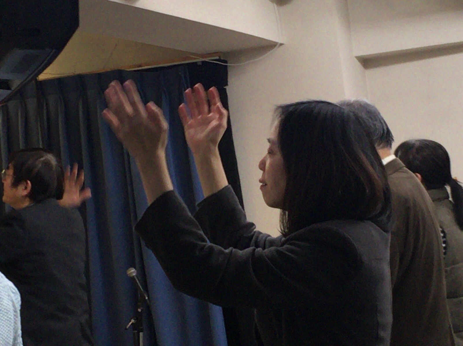 佐藤さんがリードして後半賛美です。 あっ、皆さん、立って下さい。立てる方は、立って下さい、と佐藤さん。