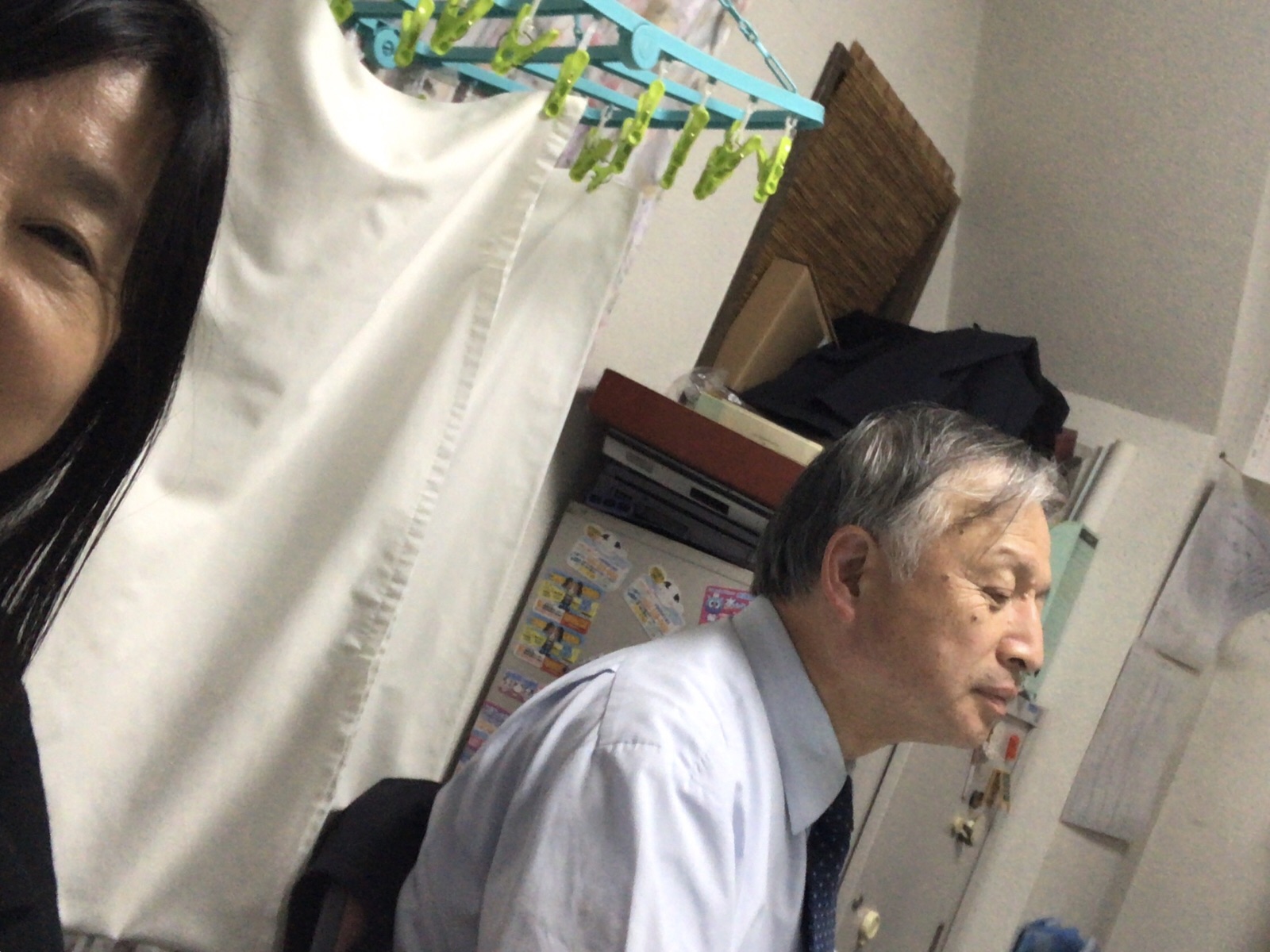 いつもの洗濯物に囲まれて… 大好きな?柿の種を頬張りながら作業中!