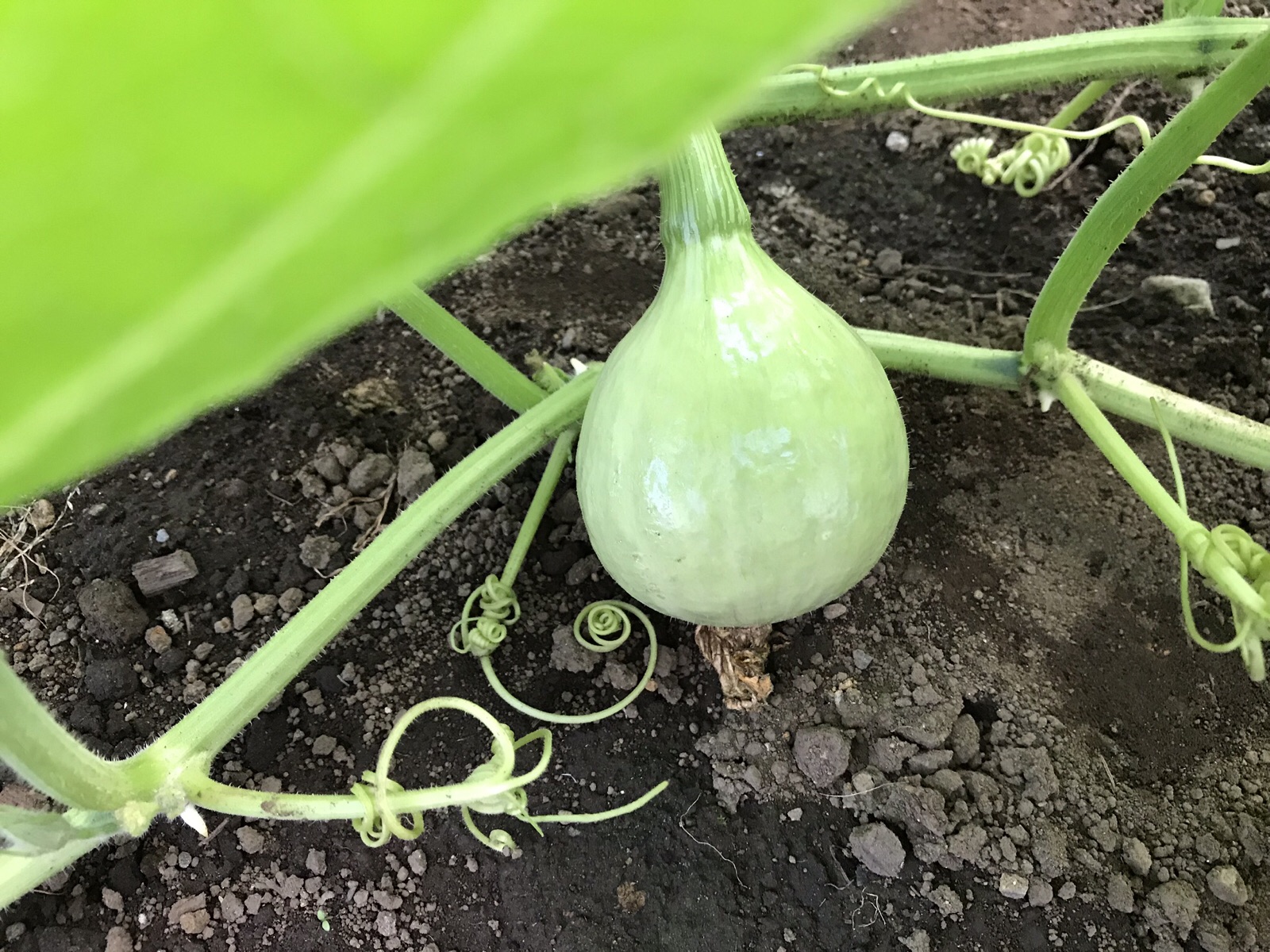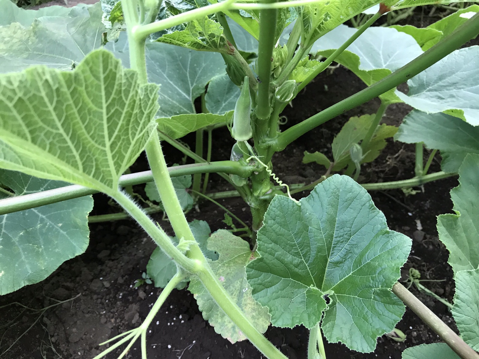 庭にたった1本育ったオクラ。実がなりました。カボチャは土質が何であろうとドンドン伸びて、わが家の庭はまたジャングルになろうとしています?… kayo.f