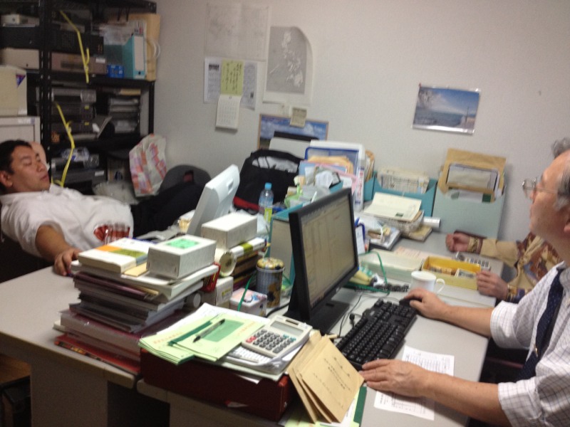 事務の仕事中の天谷牧師! 傍らには、見守っている?ピーター真境名牧師(^^)