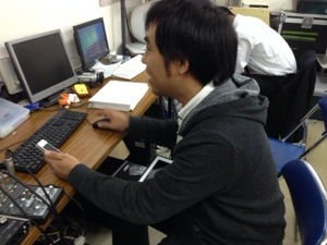デザイナー サムエルさん! テストが終わり、早速iPhoneでインターネットのお仕事をしています!