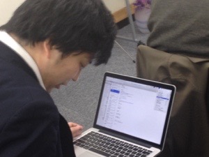 Mac でメールを確認中の笠原さん。 ほぼ毎日、持って歩いています。