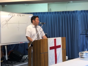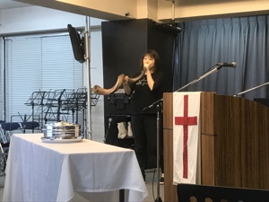 土曜礼拝、あいちゃんが角笛を吹いてスタートです!