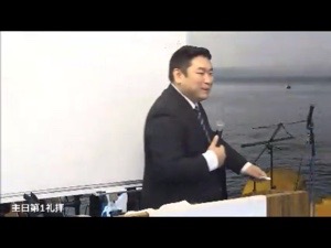 第一礼拝のメッセンジャーの真境名さん、ご夫妻で座っています。