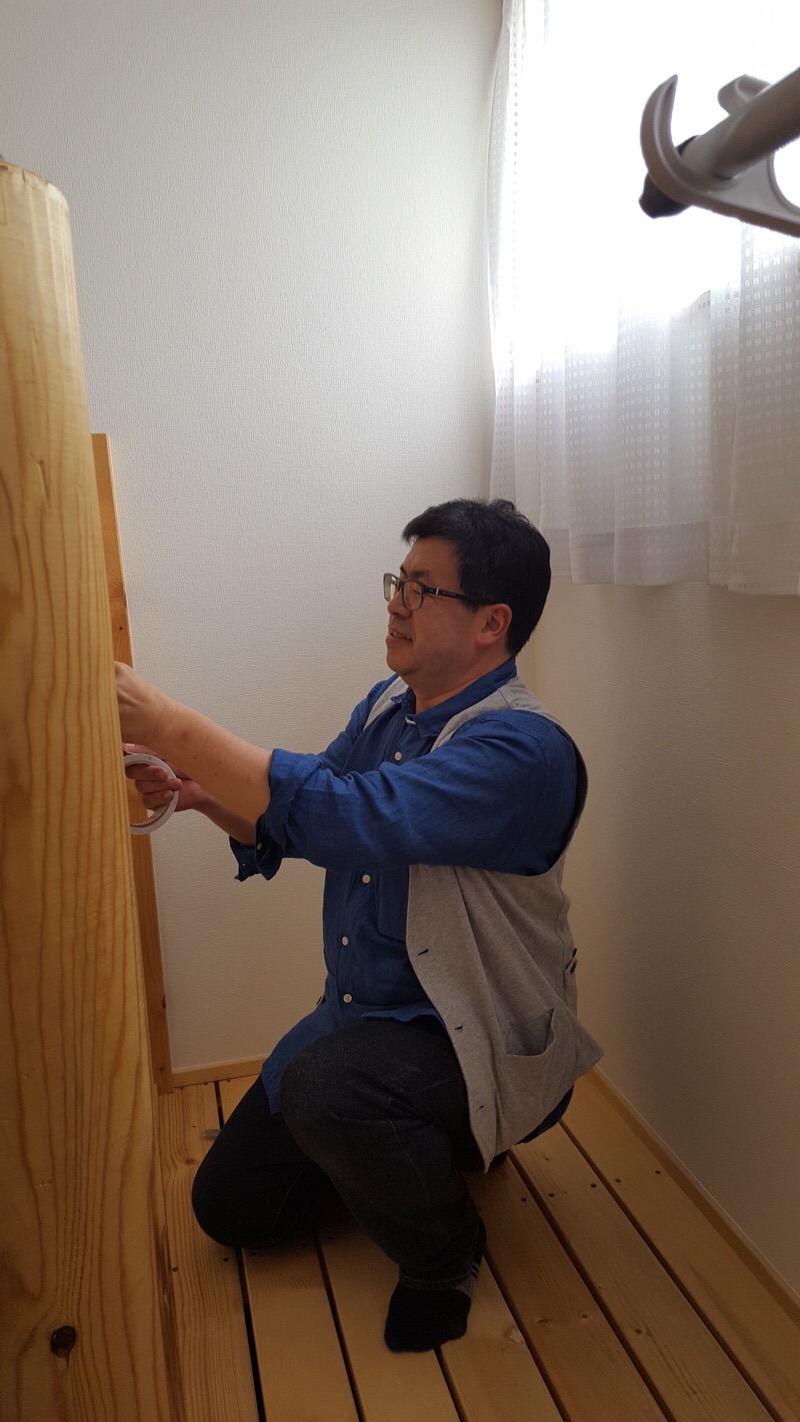 寸法を測って取り付ける様子! 設計士の柳沼さんと真栄城さんが切ったりしています! peter