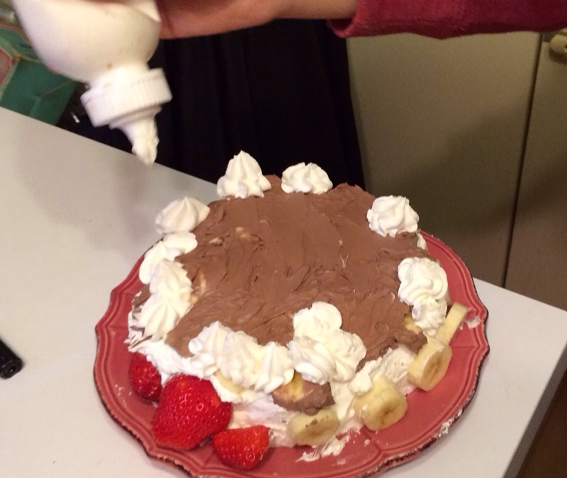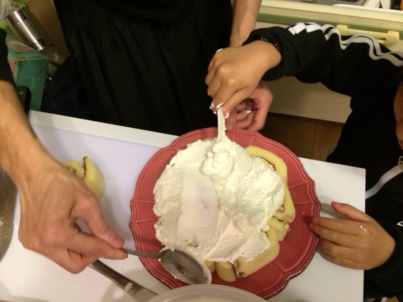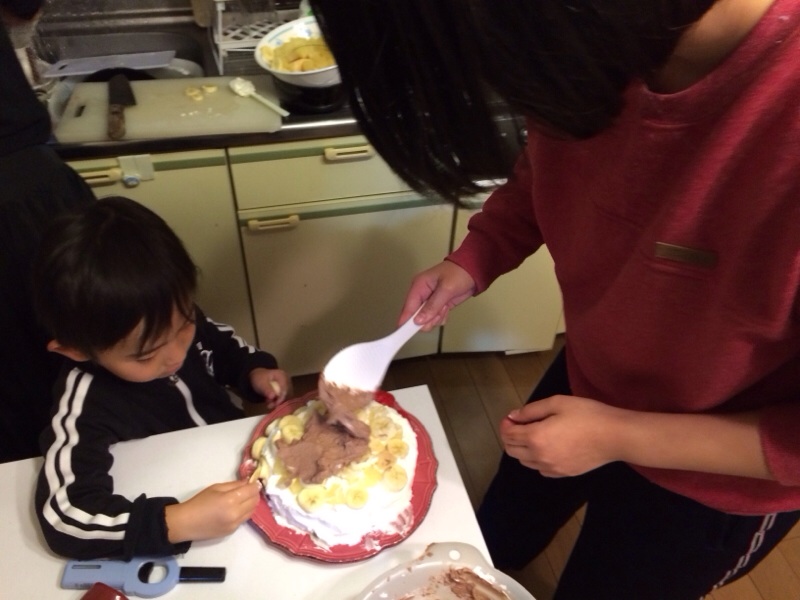 ねーねも加わりココアパウダーを加えたホイップクリームをプラスしていきます。 ゴスペルシード ヨセフ
