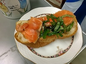 スモークサーモン&クリームチーズ&しその葉っぱの、 オープンサンドイッチです。