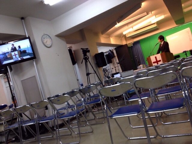 三本松牧師の頭にご注目! シャンプーを替えたからだと、ご本人は説明されています。 会堂にて