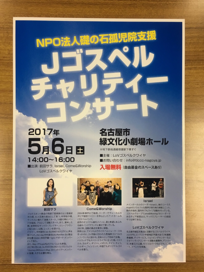 5月6日(土) 14~16時 緑文化小劇場 東京からゲストにCome&Worshipが来ます。 プロのサックス奏者で、若手注目度ナンバーワンの前田サラさんも演奏します。 GLAYのTAKUROさんと一緒にツアーをしていた実力派で、ライブのチケットも取れないほどの人気です。 入場無料ですので、お気軽にお越しください。 名古屋 Kishima
