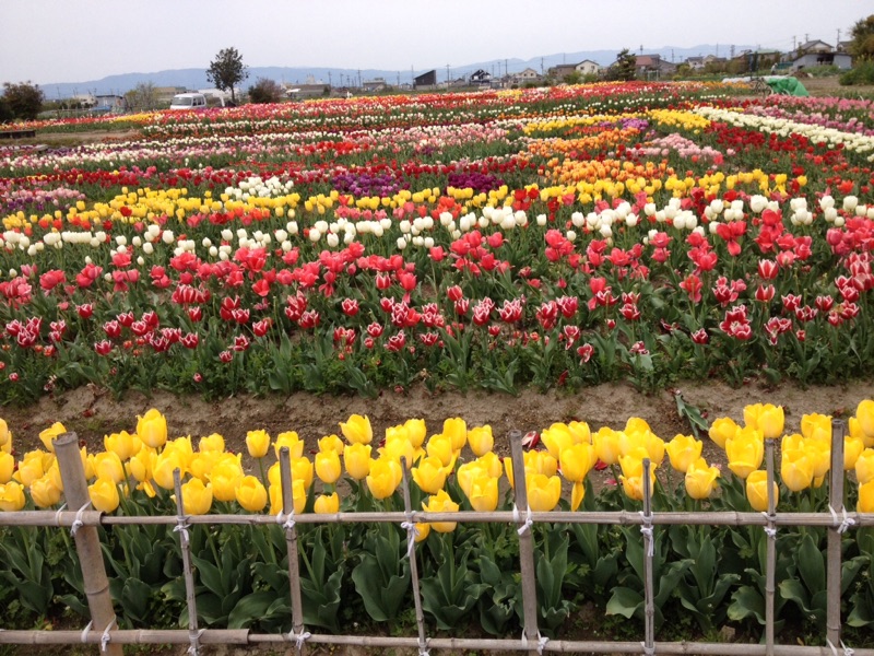 田んぼの中に一面のチューリップ畑を 見つけました。 赤、白、黄色、紫、色とりどり、 きれいです。 名古屋 furu