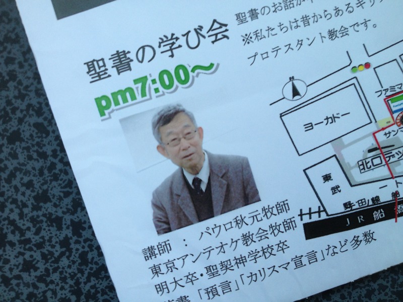 ここが船橋教会です。 コンサートのこと、秋元牧師の写真、聖書の学び会のことが書いてあります。
