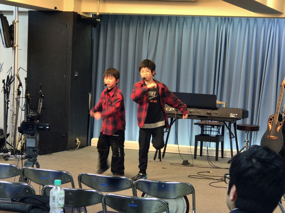 元気いっぱいの兄弟チームです。曲は『世界の終わり』。お父さんの伴奏つきです。