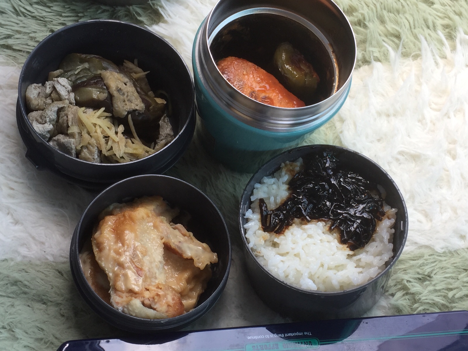茄子の煮物、鮭の焼き物(味噌マヨネーズ、蜂蜜でソース7)、ピーマンの詰め物(おから、豆腐、アズキ)でした。