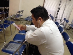 メッセンジャーの真境名さん、iPhoneで礼拝のメッセージを聞いています。