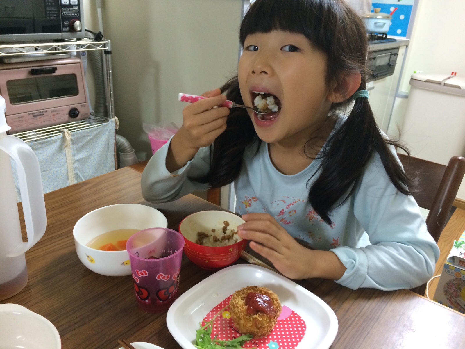 食事中も学芸会のセリフの練習に夢中になり、今日もなかなかご飯が進まない娘です…。 家に帰ってからずっとしゃべってますが、疲れないのでしょうか?? ふじい