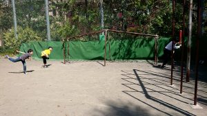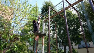 少し前の日曜日の午後、近くの小学校の校庭にて、 某少年、根性で 上まで到達しました! おめでとう! \(^_^)/ \(^o^)/