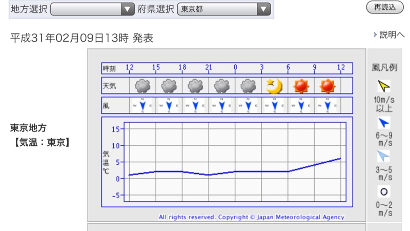 気象庁のサイトより。 東京の天気は、昨日の夕方の予報では雪でしたが、最新の予報ではこの後も曇りで、大雪の心配はなさそうです。