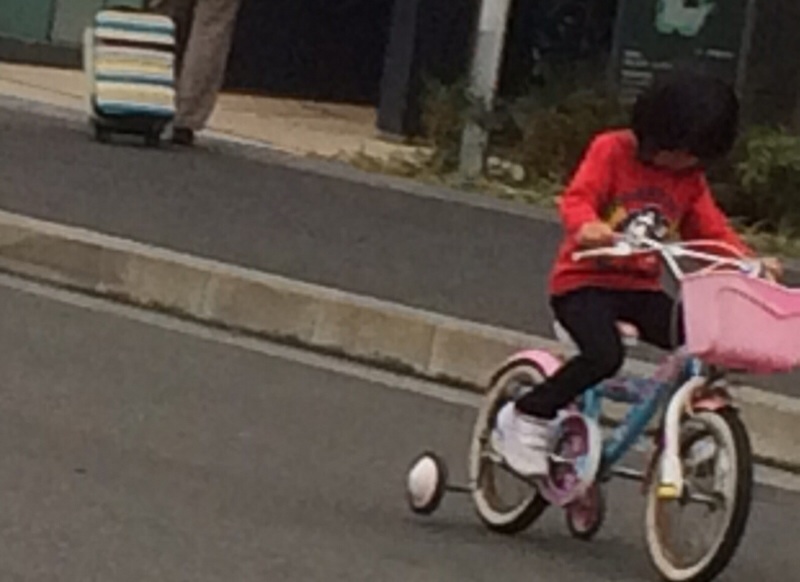 スーパーの前で小さな女の子が補助輪付きでまだおぼつかない乗り方、ガンバって(^_^)、カンボジアの子ども達も自転車の練習をしていましたね。