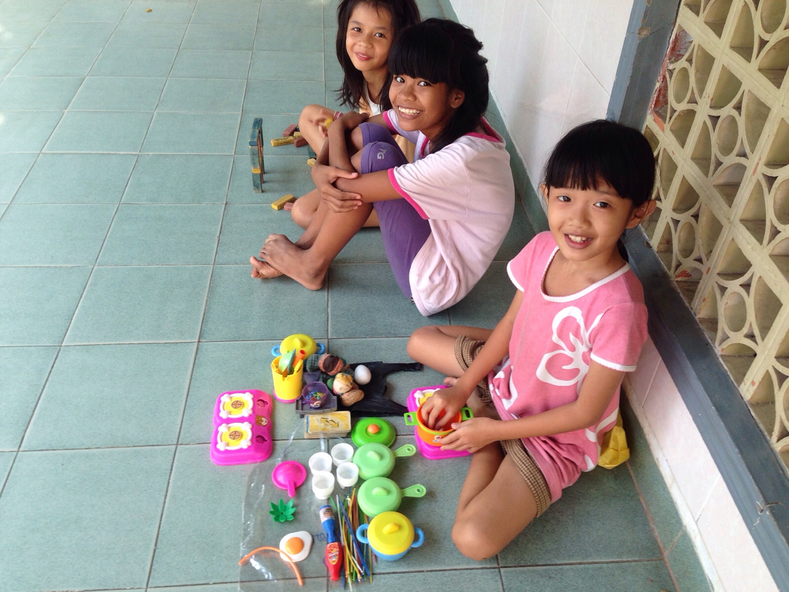 女の子達は、やっぱり”おままごと”が好きですね^o^ 売ってるのは、こちらでの朝食の定番「バーイサッチュル(豚肉ご飯)」! 美味しいよ^o^