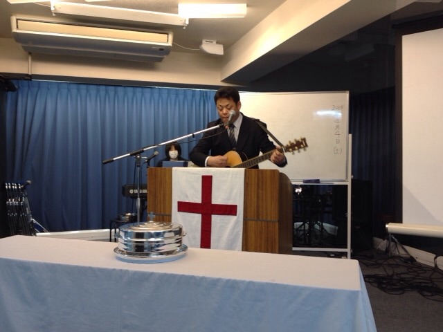 夜の土曜礼拝でメッセージされています、牧師の真境名さんです。