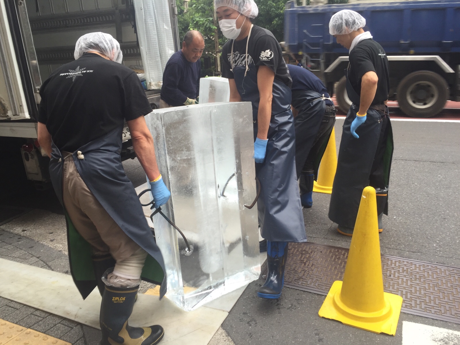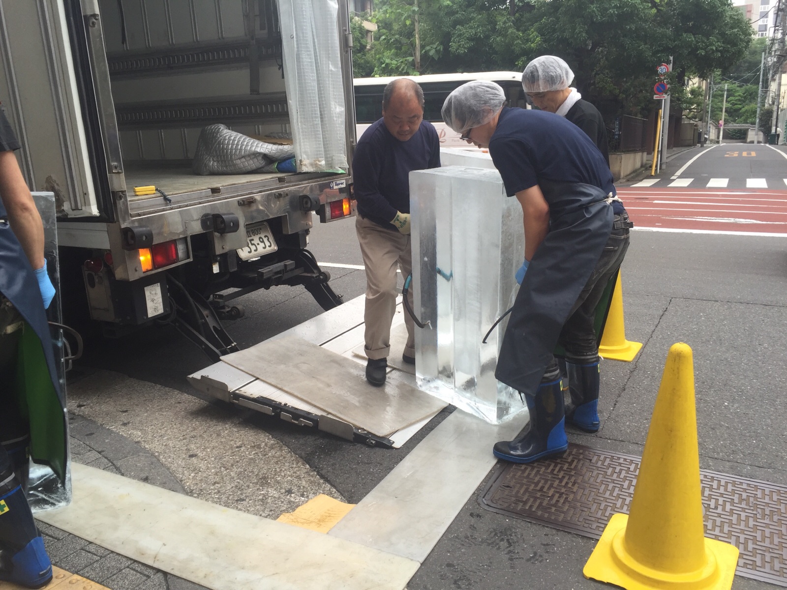 近くの氷屋さんで、巨大な氷の塊を運んでいました! Yui
