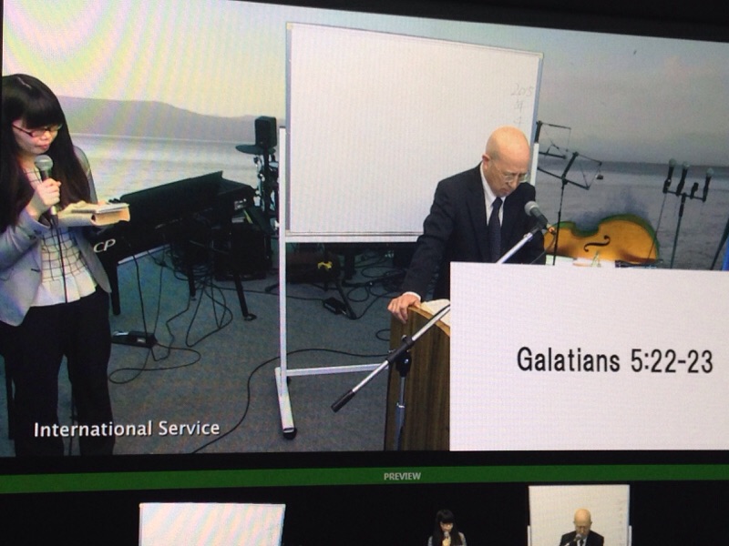 会堂では、インターナショナル礼拝が行われています! メッセンジャーは、モーセ鈴木さん、同時通訳は、未来の婦人会メンバーのナオミさん‼︎