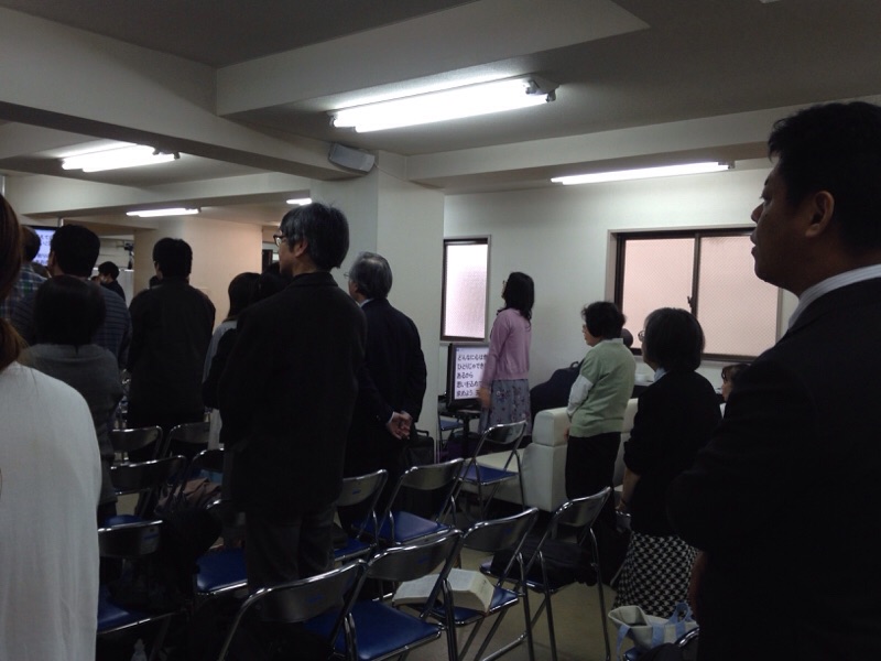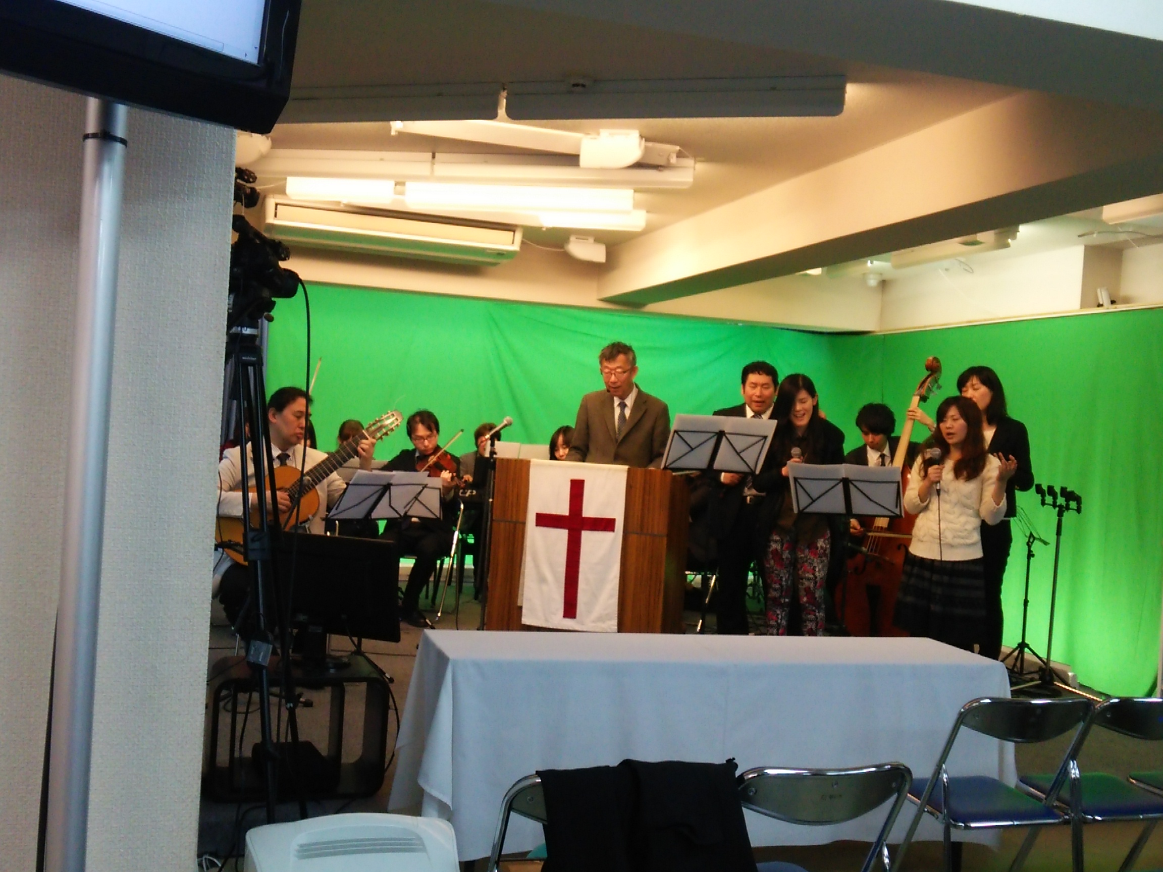 第三礼拝で奏楽されるオーケストラの皆さんと備えのお祈りをされる辻郷さん。
