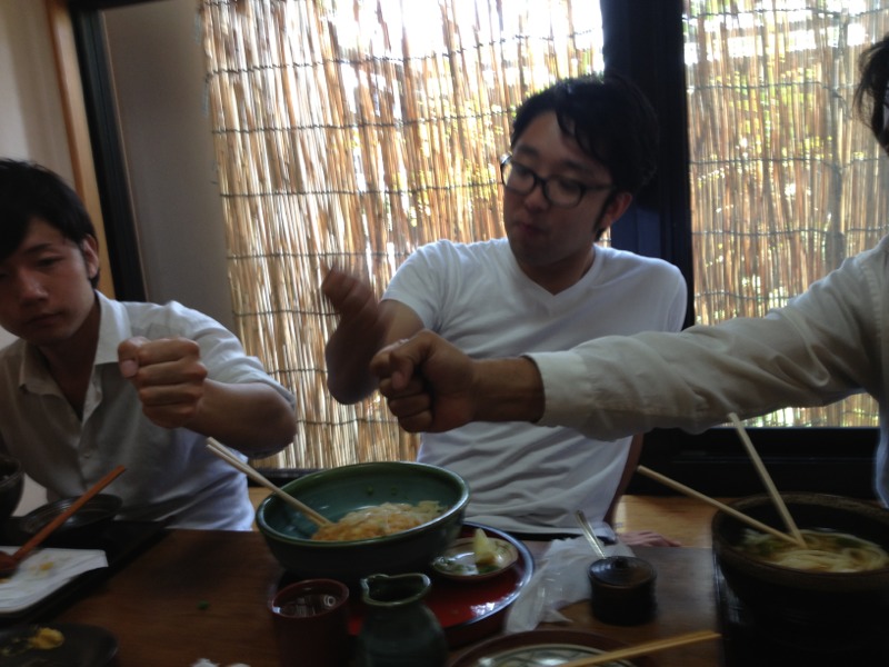 勝利のエビの天ぷらを食べるヒサの横で、お祈りし始める二人! 主よ、この事を感謝します。