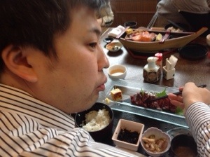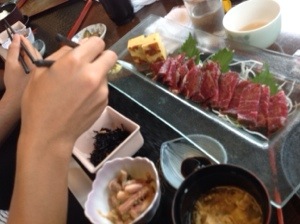 サムエルさんも馬刺! くまもん産(熊本産)の馬刺だそうです!