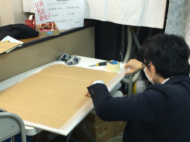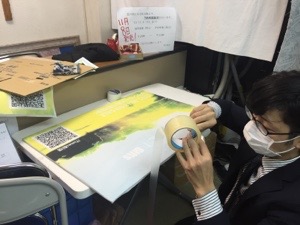 表面にテープを貼って、防水加工しています。完成まであと少し。