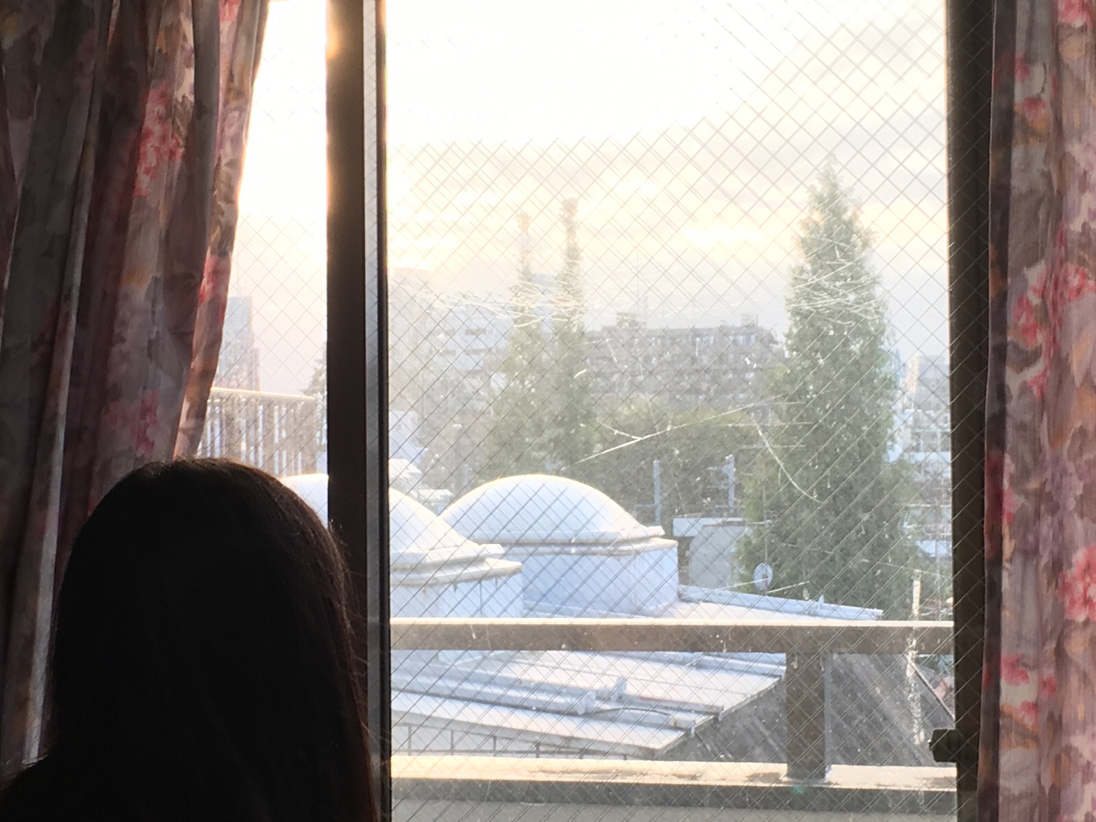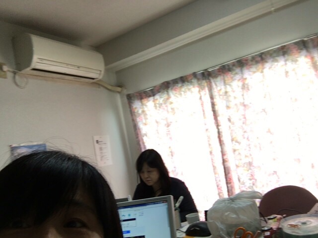 ちょっとカーテンを開けて外を見る天谷則子さん! 教会事務所にて Kayano