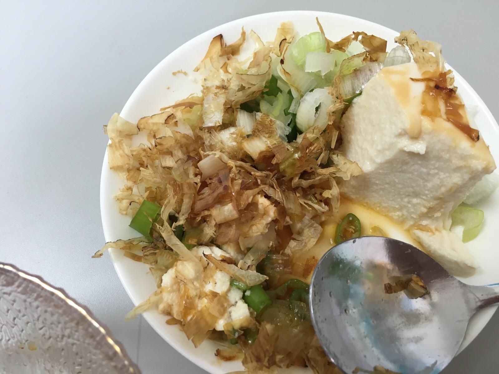 戴いたお豆腐にネギとかつおぶしが山盛りです! お皿に対して、かつおぶしが多いので、飛んでいきそう! Kayano