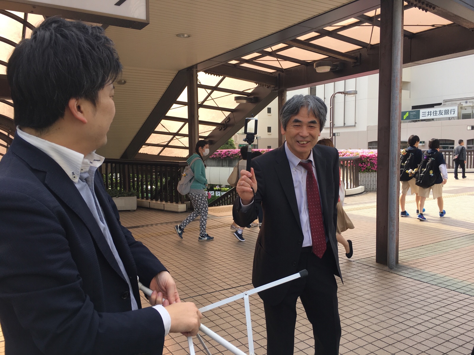 中村さんの手にあるのは? 今日は自撮り棒でガンバ!